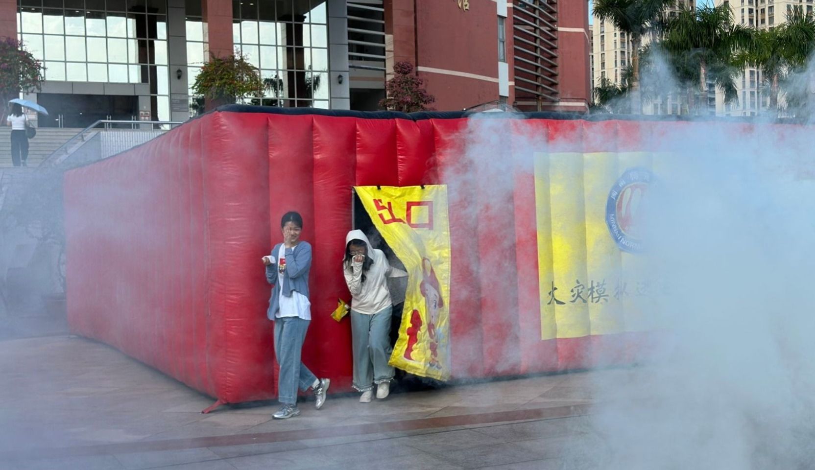 同时,为推动安全理论向实践能力转化,在逸夫图书馆前打造了“消防安全实践区”,以“实战化演练+系统化教学+沉浸式体验”相结合的方式,设置现场教学、消防器材展示、火灾模拟逃生体验屋三大板块,形成“理论讲解—实物认知—实操体验”的完整学习链条。