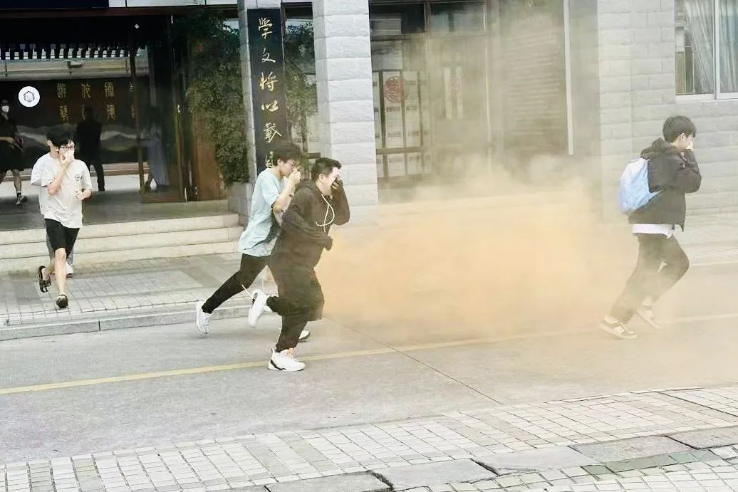 随着消防警报拉响,达理7号楼、8号楼、博文楼下燃起浓浓烟雾,楼内涌出滚滚浓烟,宿舍楼、教室、实验室内的同学们在疏散引导人员的指挥下弯着腰、猫着步,身体保持低位,并用湿毛巾捂住口鼻,沿着逃生通道快速前进,有序疏散到指定集合地点。