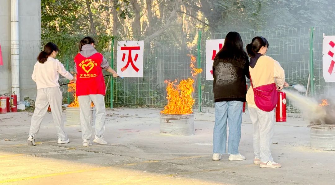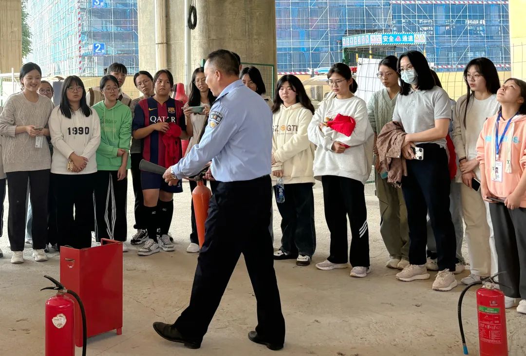 消防人员进行现场授课,消防员同志强调了宿舍的用电安全,并且示范了火场逃生的正确方法。授课内容紧贴校园实际,重点围绕校园常见火灾预防、初期火灾处置、高层火灾疏散逃生等,全方位、多角度、高站位阐述了校园火灾的危害性,进一步强化学生消防安全意识。随后,保卫处组织参加演练师生到消防演练基地进行灭火演练,保卫处消防负责人在现场给同学们普及一系列消防安全知识以及灭火器的正确使用方式,最后指导同学们进行实践操作。在实践操作中,保卫处指导人员现场教授学生如何观察位置精准灭火,同学们认真学习相关知识,并积极上手进行实践操作。