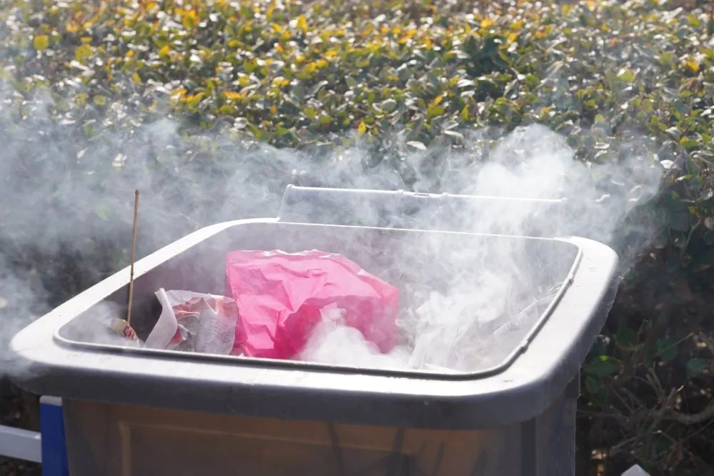 烟头接触位置的塑料片立刻开始熔化,纸巾开始冒烟。垃圾桶内就出现了阴燃,随后不到1分钟窜出明火。