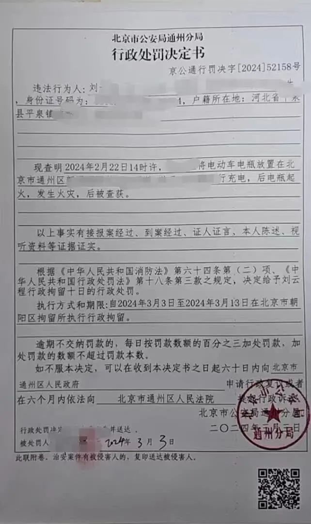 3月12日,北京日报(ID:Beijing_Daily)记者从北京市消防救援总队了解到这起电动自行车火灾的处理结果,当事人被处以行政拘留10日的处罚。