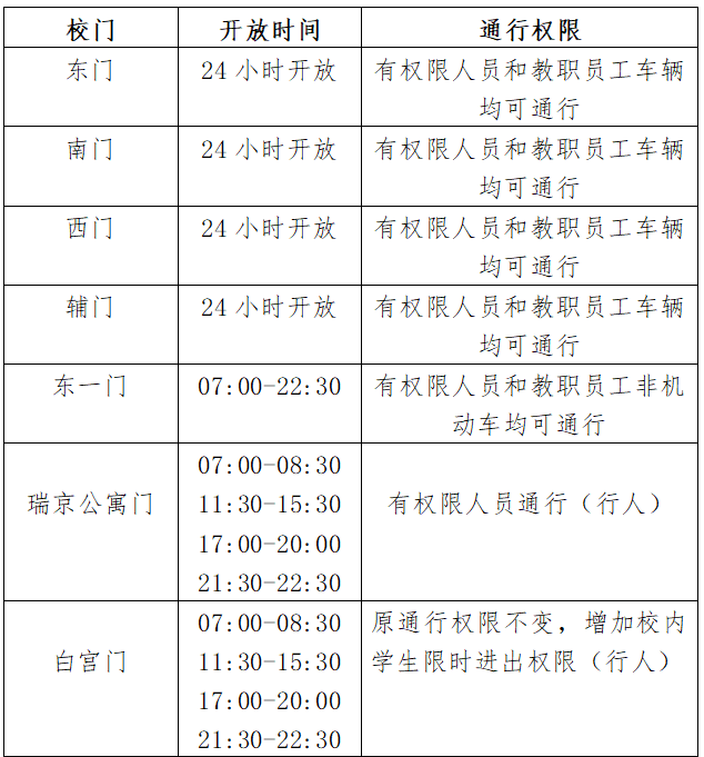 1.东一门、瑞京公寓门原作为消防应急通道门,不对外开放,现考虑师生通勤需求,在上下学高峰时段对师生步行开放,其他时间段仍封闭作为消防应急通道。请师生将通勤的非机动车停放在校门外市政规划划线区域内,禁止占用消防通道、机动车道或阻碍行人通行。若消防、交管、城管等部门反馈存在安全隐患或秩序问题,学校将立即恢复原管理模式。